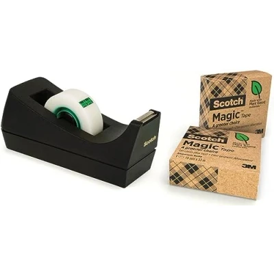 Scotch Magic Tape Dispenser 100% Recycled Plastic Black Includes 3 Rolls of Invisible A Greener Choice 19mm x 33m Ideal For School, Home And Office