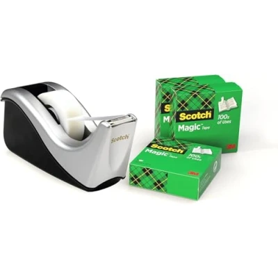 NON-SKID, WEIGHTED BASE: The weighted and non-skid base allows for easy one-handed unrolling and cutting of tape EASY TO USE: Easy to find the end of the tape, unwind the roll and cut the desired length of the tape REFILL, REUSE, REPEAT: Dispenser is easy to refill with Scotch Brand tapes with 2.54 cm core Scotch Magic Invisible Tape included