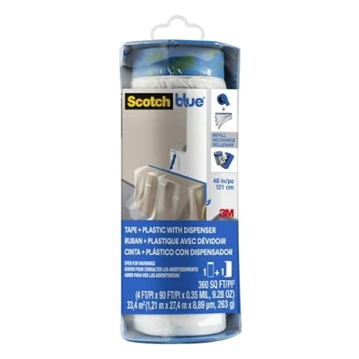 Tape and plastic combined in one product Protects against accidental paint splatter Has static cling to stay in one place Easy to apply and readjust Plastic unfolds to 48” long Compact dispenser makes it easy to unroll and cut the length you need. Tape provides super sharp paint lines Up to 14 day clean removal, Weight: 0.75 pounds, Manufacturer: 3M