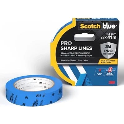OUR SHARPEST LINE YET: The ScotchBlue PROSharp Lines Advanced Masking Tape is engineered to provide our sharpest paint lines yet, this ScotchBlue painters tape provides super-sharp paint lines and professional results 21 DAY CLEAN REMOVAL: The painting tape ensures clean removal for up to 21 days after application, leaving behind no damage or sticky residue, even after exposure to sunlight ADHESIVE LEVEL: Medium USE INDOOR OR OUTDOOR: This masking tape is designed for use on multiple indoor or outdoor surfaces, such as smooth or lightly textured walls, trim, baseboards, wood, tile, and glass MULTI-LAYER PAINT BLEED BARRIER: The multi-layer construction and premium smooth backing of this masking tape provides enhanced resistance to tears or slivering and promotes even adhesion to prevent paint seepage SUSTAINABILITY: Made with 100 Percent PEFC paper, 40 Percent renewable resources, with a solvent-free adhesive, and a core made with 70 Percent post-consumer waste Easy to tear by hand For walls, doors, windows, skirting boards and vinyl TAPE APPLICATION TIPS: Easily tear by hand; Ensure surfaces are clean, dry, and dust-free for proper adhesion; Apply tape while pressing down firmly; Let it set for 30-60 minutes before painting for better results TAPE REMOVAL TIPS: Wait for paint to dry to the touch; Remove tape by slowly pulling it back on itself at a 45-degree angle for a clean finish, Manufacturer: 3M