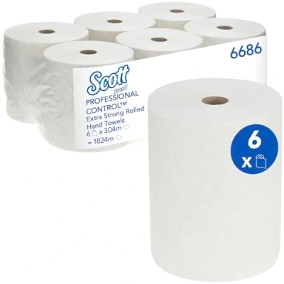 Scott Hand Towels 6686 White Paper Roll Towels, 1 Ply, Ultra Absorbent & Strong, Ideal for Washrooms 6 Rolls x 304m (1,824m Total)