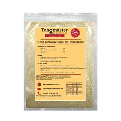 Traditional Scottish sausage seasoning gives an intense beef flavour. Use 100g mix per 800g minced meat, includes rusk. This pack will make 1kg of sausages. Use with beef, chicken, pork, lamb or alternative! Simply add this seasoning to minced meat & water. Fill the sausage meat into collagen or natural casings using vegetable oil for a professional sheen. The colder the meat and water, the better the appearance and life of the sausage. Leave sausage meat in the fridge overnight to allow the herbs and spices to marinade with the meat. Fill using a sausage stuffer machine.