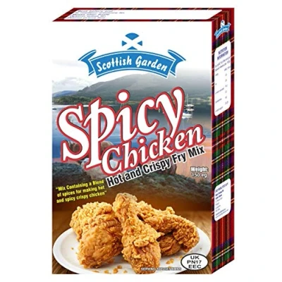 Mix Coating a Blend of spices for making Hot and Spicy Crispy Chicken Hot & Spicy Chicken Fry Mix 150g Chicken coating, Mild or Hot & Spicy Flavour. The original is made with a special blend of herbs and spices, a favourite especially amongst kids. Now no longer buying fried chicken is fun when Scottish Garden Fry Mix enables you to make it in your home Instructions: 1) Empty the required amount of chicken fry mix in a bowl. 2) Coat chicken pieces in whisked egg or milk. 3) Put the chicken pieces in the bowl and coat evenly with the mix. 4) Heat oil in a deep frying pan. 5) Deep fry the chicken for approx. 15 minutes, medium heat, turning occasionally. 6) Ensure fully cooked and piping hot through.