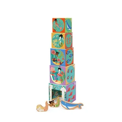 The colourful illustrated stacking tower contains five cubes in different sizes and three cute wooden figures (2 mermaids and 1 whale). The tower is made of strong, durable cardboard. The figures are made of high-quality wood. Design the tower according to your wishes, rebuild it or create an accommodation for your little underwater friends - there are no limits to your imagination! Scratch: The attractive design from Belgium brings extra joy when playing and discovering, the motifs stimulate the imagination. Recommended from 12 months, Manufacturer: SCRATCH