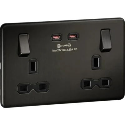 Screwless Double Switched Socket with Dual USB C [65W Fast Charge] Smoked Bronze