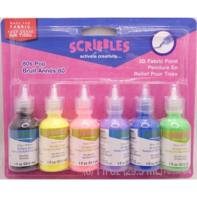 Scribbles 3D Fabric Paint 80's Pop ncludes 6 bottles of coordinating 1-oz. paints Bright neon paints with a shiny finish Paint dries permanent and machine washable on fabric Won't crack or peel when dry - ultra flexible! Easy squeeze bottles make paint application simple for all skill levels IL26512 MPN 26512