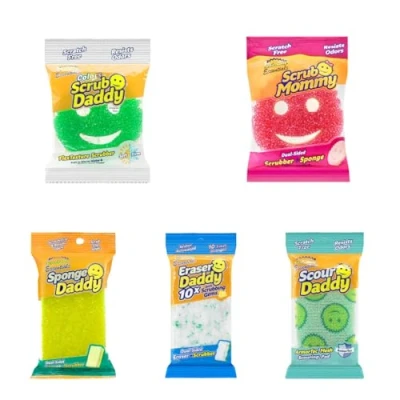 Scrub Daddy Essentials Complete Bundle with Mommy, Scour Daddy, Sponge & Eraser Smiley Face Sponges for Cleaning Washing Up, Multipack Kitchen Non Scratch Scourers, Pack of 5