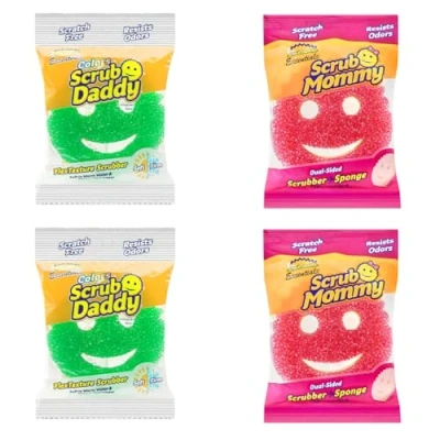 Scrub Daddy & Mommy Essentials Smiley Face Sponges for Cleaning Washing Up, Multipack Kitchen Non Scratch Scourers with FlexTexture Firm Soft Scrubbing, Dishwashing Scrubber, Pack of 4