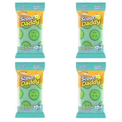 Scrub Daddy Scour Essentials, Scourers Sponge, Non Scratch Scouring Pads, Heavy Duty Scourer Pad for Cleaning Dishes, Alternative to Metal Kitchen Scourers, Washing Up Dish Sponges, Pack of 4