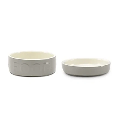 This 2 Piece Set contains 1 x Scruffs Classic Pet Saucer – 13cm in Grey and 1 x Scruffs Classic Food Bowl - 13cm in Grey Thick sides help keep food cooler for longer, with ergonomic finger hold for easier serving and lifting Made from heavy stoneware ceramic to help prevent pets from moving the bowls around when eating Chip and bite resistant as well as dishwasher and microwave safe The pet saucer helps with whisker fatigue. Cats suffer from whisker fatigue if their cheek and chin are continually pressing against bowls when drinking. Our cat saucer is just 3cm high, which allows whiskers to avoid walls when drinking