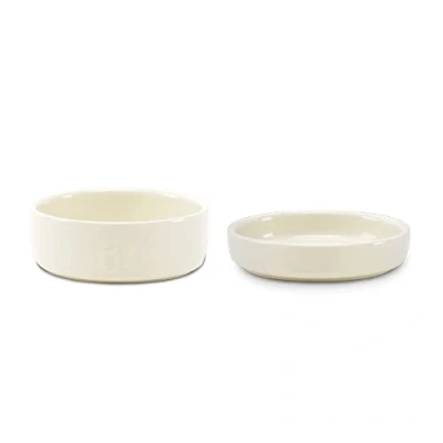 This 2 Piece Set contains 1 x Scruffs Icon Pet Saucer – 13cm in Cream and 1 x Scruffs Icon Food Bowl - 13cm in Cream Thick sides help keep food cooler for longer, with ergonomic finger hold for easier serving and lifting Made from heavy stoneware ceramic to help prevent pets from moving the bowls around when eating Chip and bite resistant as well as dishwasher and microwave safe The pet saucer helps with whisker fatigue. Cats suffer from whisker fatigue if their cheek and chin are continually pressing against bowls when drinking. Our cat saucer is just 3cm high, which allows whiskers to avoid walls when drinking