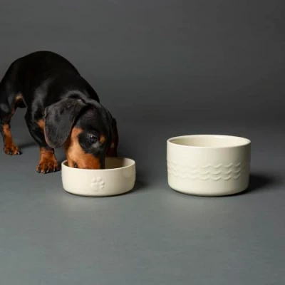 This 2 Piece Set contains 1 x Scruffs Icon Pet Food Bowl – 13cm in Cream and 1 x Scruffs Icon Water Bowl - 15cm in Cream Thick sides help keep food cooler for longer, with ergonomic finger hold for easier serving and lifting Made from heavy stoneware ceramic to help prevent pets from moving the bowls around when eating Chip and bite resistant as well as dishwasher and microwave safe The water bowl is designed specifically for dogs to drink from with comfort. Dogs drink differently than most mammals as their tongues bend backwards so that they scoop water up into their mouths. The high sides of this bowl give the depth needed to make it easier and more comfortable to drink from.