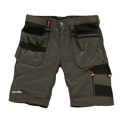 Hard-wearing work shorts designed for lasting comfort. Regular fit for classic look. Lightweight twill fabric with heavy-duty canvas pocket reinforcements and triple-stitched seams for durability. Features cargo pocket, rule pocket, mobile phone socket and secure zipped pocket. Hammer loop, tool loops and D-ring for transporting tools and accessories while on the job. YKK zipped fly. 65% polyester, 35% cotton, 250gsm.