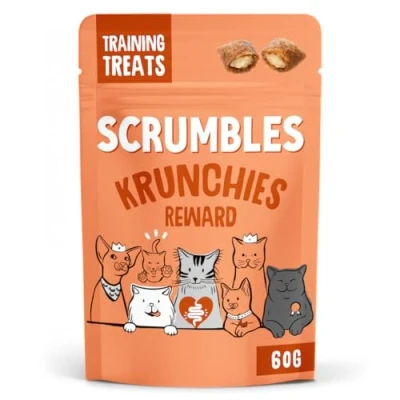 Crunchy on the outside, soft on the inside, Scrumbles Krunchies are delicious chicken treats for cats Made with natural ingredients packed with chicken plus pumpkin for digestive health Suitable for adult cats & kittens from 8wks +