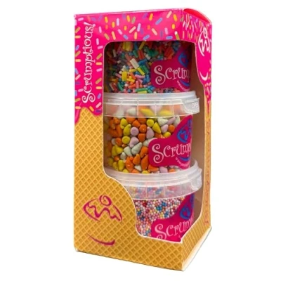 THREE VARIETIES - Mixed ice cream decorations and toppers. This trio contains fun chips (colourful sugar coated chocolate chips), matt rainbow strands and multicoloured hundreds and thousands or non pareills. All presented in a pretty gift box ICE CREAM THEME - Perfect decorations for adding colur, flavour and texture to your ice cream and cakes. Perfect for all occasions and events. Enhance your cakes, chocolates, cupcakes, ice cream and desserts with these delicious toppings MIXED SPRINKLES - These carefully selected sprinkles and inclusions offer a combination of flavours and textures which create a dramatic finish to any ice cream or baking project A GREAT GIFT - Our Scrumptious! Trios are a great gift for bakers! This unique present will delight any baking fan of any age HAND PACKAGED - Our UK-based headquarters meticulously hand-packages each Scrumptious! pot, ensuring that every little tub is carefully selected just for you, Manufacturer: Truly (UK) Ltd