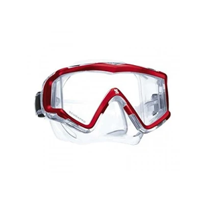 A single oversized lens and seamless side windows allow for a wide field of view underwater. The double seal silicone skirt offers a convenient closure that prevents water from entering. Swivel buckles allow for a perfect fit, and the exclusive painting process allows you to dive in style. Red / Transparent