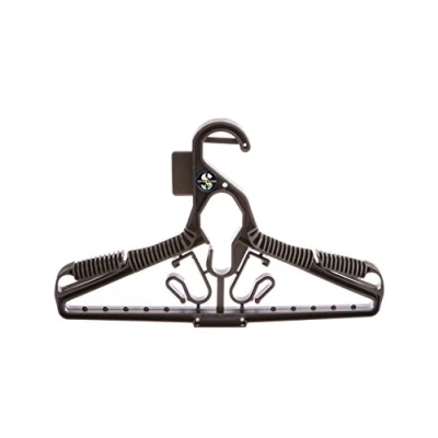 Regulator slips into central U-hook. BC slips under shoulder hooks. Wetsuit hangs over central bar or shoulder hook. Booties are pinched by retainers. Extra tank-valve O-rings nest in indentation.