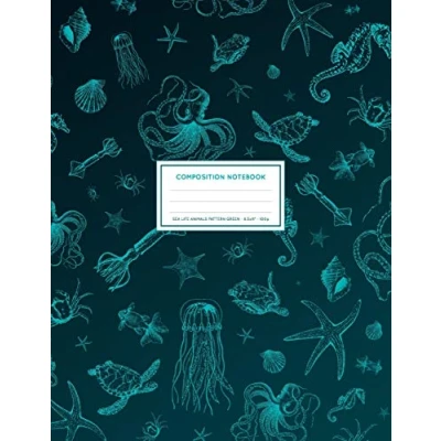 Sea Life Animals Pattern Green: Ocean Notebook College Ruled With Octopus, Horse, Turtle, Squid And Jellyfish 8.5x11" LARGE 100 Lined Pages