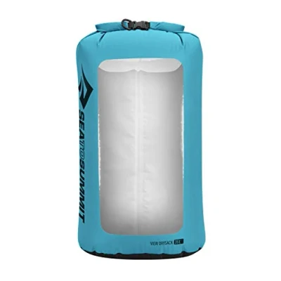 Lightweight 35-liter roll-top dry sack is a see-thru dry storage and packing organizing option for backpacking, hiking, camping, sea kayaking, ski touring, cycling, and travel Manufactured from lightweight PU-coated 70D nylon, with a TPU clear window for easy identification of contents; 10,000mm waterhead (the higher the waterhead rating, the more waterproof the fabric) Reinforced waterproof seams are double-stitched, and tape sealed; secure hypalon roll-top closure with a D-ring for easy attachment
