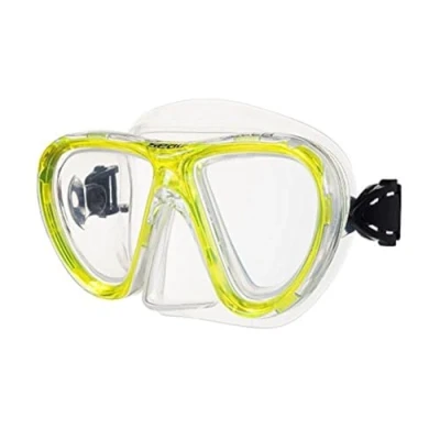 Snorkeling mask for kids Bi-lens mask with tempered glass Comfortable liquid silicone facial Buckle with easy adjustable system Available in silicone clear blue and yellow and in colored silicone turquoise and pink