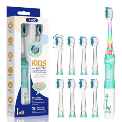 DESIGNED SPECIFICALLY FOR AGES 3-12 KIDS: SEAGO SG977 kids battery-powered toothbrushes are FDA approved and designed according to children's oral and dental characteristics with strict criteria. Our kids sonic toothbrush with Soft DuPont Nylon Bristles, ABS and TPE Brush Heads. The childrens electric toothbrush with 4 replacement Heads, IPX7 Waterproof, 24,000 strokes per minute Gentle Vibration. Comfortable, safe, deep clean, and protect child's teeth, enamel and gums MAKES BRUSHING MORE FUN: The kids' electric toothbrushes age 3-12 years with Cute toothbrush handle, Cartoon giraffe pattern, and Colorful Rainbow Flashing LED Lights. Our toddler electric toothbrush is perfectly designed to make brushing easy and fun for little brushers aged 3 and over. The White LED Mouth Lamp of this toddler electric toothbrush 3+ years old enables parents to observe kids' inner teeth and gum more conveniently MAKES BRUSHING EASIER: Seago's second childrens electric toothbrushes for 3-5 6-12 years with Non-slip handle that fits the children's little hands, “One button light on”, simple operation. With 30s timing smart reminder and 2 minutes auto-off function, the kids toddler toothbrush teaches children the correct way to brush teeth as dentist recommend. Our childrens toothbrush easy to learn, easy to use, encourage kids get into the good brushing habit of teeth cleaning BATTERY POWERED & IPX7 WATERPROOF: This kids electric toothbrush is powered by 1 x AAA 1.5V battery (not included), safe and convenient. One battery can last for 150 days in theory ( twice of 2 mins a day ). IPX7 waterproof design, the toothbrush can be washed with water after brushing Package includes: 1 toothbrush handle, 8 replaceable brush heads, 1 Protective Bristle Cover and 1 Instruction Manual. Please replace the kids toothbrushes brush head when the blue color on the brush head is faded 3-Year Service & Support: If you need any help, contact us in Amazon. Login your amazon account > choose "Your orders" > find the order ID > click "Contact seller". We will replace a new one if there is a quality problem within 3 year. This not only helps you get a better service, but also gives us a deeper understanding of our customers' needs and expectations.