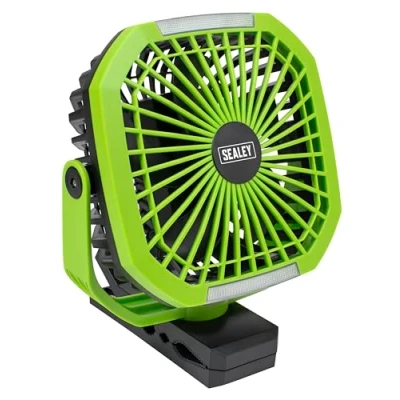 Sealey 4-Speed Portable Clip Fan with Worklight 8" Features: Portable 8" fan with a light function. Heavy-duty clip and magnet base means you can position the fan in any place at any time. It can be used on a desk, in a workshop, in and around the house or even outdoors day or night. Four speed settings and 360° rotation in all directions. Two light modes are an additional feature. This fan is battery operated and is supplied with a 3.7V 4000mAh lithium-polymer battery. It can operate up to 10hrs on a full charge. Supplied with USB-A to USB-C port and cable. It is fully charged within 5hrs. It also has a power bank function with 5V⎓1A output. Technical Details: • Portable 8" fan with a light function. • Heavy-duty clip and magnet base means you can position the fan in any place at any time. • Four speed settings. • 360° Rotation in all directions. • Two light modes. • Battery operated and is supplied with a 3.7V 4000mAh lithium-polymer battery. • Power Bank function with 5V⎓1A output.