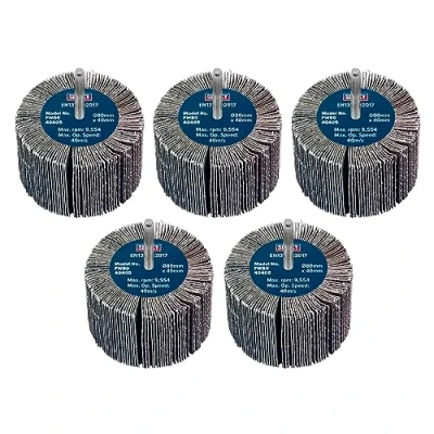 General description Sealey 80 x 40mm Abrasive Flap Wheel on 6mm Shaft is designed for finishing curved and intricate metal surfaces. This product is made from aluminium oxide and is supplied in a pack of 5. Technical specifications Diameter: 80mm Width: 40mm Shaft diameter: 6mm Abrasive type: Aluminium oxide Grit: 40 Max. RPM: 9,554 Max. Operating Speed: 40m/s Model No.: FW8040405 Compatibility and accessories Suitable for use with power drills