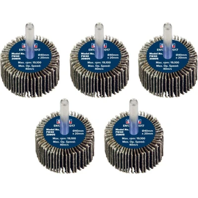 ManoManoGeneral description Aluminium oxide abrasive flap wheel ideal for finishing curved and intricate metal surfaces. Supplied in a pack of 5. Technical specifications Dimensions: 40 x 20mm Grit: 80 Max. RPM: 19,100 Operating Speed: 40m/s Shaft Diameter: 6mm Model No.: FW4020805 Compatibility and accessories Suitable for use with power drills