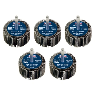 General description Sealey 50 x 25mm Abrasive Flap Wheel on 6mm Shaft 60Grit is designed for finishing curved and intricate metal surfaces. This product is supplied in a pack of 5, making it a convenient choice for various applications. Technical specifications Material: Aluminium oxide Dimensions: Ø50 x 25mm Grit: 60 Max. RPM: 15,200 Max. Operating Speed: 40 m/s Shaft Diameter: Ø6mm Model No.: FW5025605 Compatibility and accessories Suitable for use with power drills
