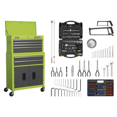 Sealey American Pro Topchest & Rollcab Combination 6 Drawer Ball Bearing Slides Hi Vis Green/Grey 128pc Tool Kit