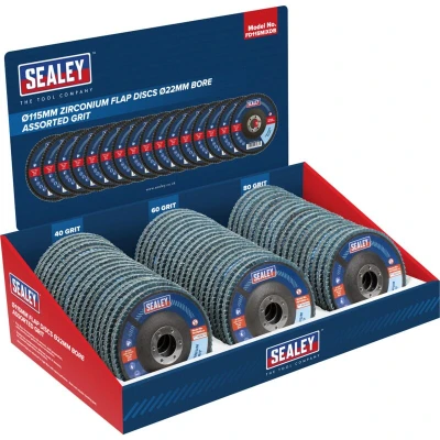 Sealey Assorted Grit Flap Discs Zirconium 115mm 22mm Bore Display Box of 60