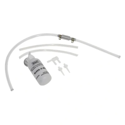 ManoManoGeneral description Sealey Brake Bleeder Set with Container is designed for efficient brake fluid bleeding. It features a composite 100ml collection bottle equipped with a magnetic locating pad for easy positioning during use. Technical specifications Collection bottle material: Composite Capacity: 100ml Model No.: VS02011 Nett Weight: 0.07kg Compatibility and accessories Supplied with non-return valve Tubes and connectors included Other information
