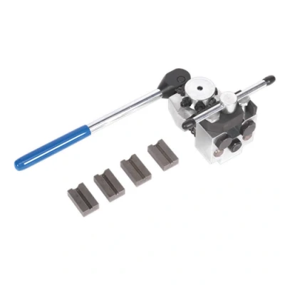 ManoManoGeneral description Sealey Turret Type Brake Pipe Flaring Kit is designed to produce accurate automotive double flares on most common sizes of brake pipe. It is user-friendly, featuring a cam-action body that can be easily mounted in a bench vice for convenience. The kit includes various dies and clamp blocks to accommodate the most popular flare sizes, ensuring versatility in your automotive tasks. Technical specifications Model No.: PFT07 Nett Weight: 5.21 kg Dies included: 4.75mm, 3/16", 1/4", 5/16", and 3/8" Clamp blocks included: 4.75mm, 3/16", 1/4", and 5/16" Compatibility and accessories Optional 3/8" clamp block available. Other information