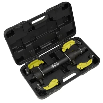AmazonSUITABLE FOR MACPHERSON STRUTS – Designed to tension MacPherson struts. 300MM WORKING AREA – Suitable for spring diameters Ø80-265mm. RIGHT-HANDED COIL SPRING COMPRESSOR – Compresses right-handed coil springs and is ideal for applications such as changing shock absorbers. PLASTIC YOKE PROTECTORS- Protect spring coating from damage. SAFETY YOKES - Carefully shaped to stop spring bowing under compression. FEATURES SAFETY CLAMP – Securely holds spring in place when under tension. SUPPLIED IN STORAGE CASE – For convenient storage solutions., Weight: 26.014546916 pounds, Manufacturer: Sealey