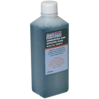 ManoManoGeneral description Sealey Combustion Leak Detector Fluid is a specialized fluid designed for detecting combustion leaks. It is suitable for use with Model No's VS0061 and VS0062 Combustion Leak Detectors, as well as other leading brands of detectors. The fluid changes color upon detection of CO2 gas, providing a clear indication of leaks. Technical specifications Model No.: VS0061F Nett Weight: 0.19 kg EAN: 5024209785006 Other information