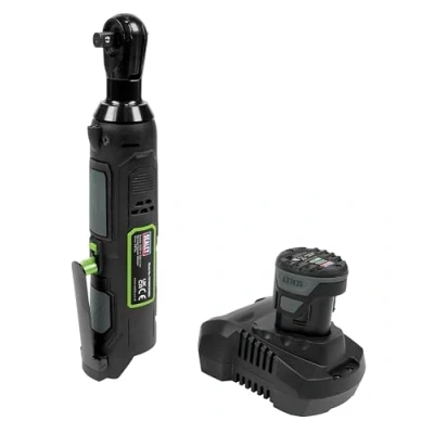 Part of the SV10.8 Series powered by fast charging high output lithium-ion batteries, designed to make everyday tasks quick and easy. Compact, lightweight cordless ratchet wrench. Spindle locking that gives more control during application. Quick stopping function. Forward and reverse control. No-Load Speed: 0-300rpm. Maximum Torque: 45Nm(33lb.ft). Supplied with fast mains charger and 1 x 2Ah rechargeable lithium-ion battery. PACKAGE INCLUDES: CP108VCRWBO - 10.8V SV10.8 Series 3/8"Sq Drive Cordless Ratchet Wrench - Body Only, CP108VBP - 10.8V 2Ah SV10.8 Series Lithium-ion Power Tool Battery, CP108VMCEU - 10.8V SV10.8 Series Fast Charge Lithium-ion Battery Charger - European Plug., Manufacturer: Sealey