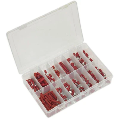 This comprehensive assortment of red crimp terminals includes a total of 260 pieces, conveniently supplied in a partitioned storage box for easy organization and accessibility. These terminals are essential components for various electrical connections, making them ideal for automotive, marine, and DIY projects.