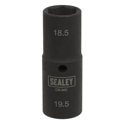 ManoManoGeneral description Sealey SX1819 Double Ended Impact Socket is designed for the easy removal of wheel bolts and nuts with missing or distorted caps. This socket features a thin-wall design that allows it to fit a wide range of applications, making it a versatile tool for automotive tasks. Technical specifications Double ended size: 18.5mm / 19.5mm Length: 80mm Drive size: 1/2"Sq Model No.: SX1819 Compatibility and accessories Suitable for Ford, GM, Jeep, Chrysler Other information Black phosphate finish