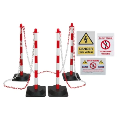 This kit includes six red and white posts and bases, along with a 25-meter length of red and white plastic chain (6mm in diameter) and chain securing hooks. The vivid red and white colours provide high visibility, essential for marking off dangerous areas and ensuring safety during vehicle service and repair.
