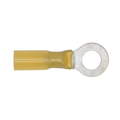 ManoManoGeneral description Sealey Heat Shrink Ring Terminal 8.4mm, Yellow - Pack of 25 features fast shrink adhesive lined tubing, ensuring a secure and reliable connection for your electrical projects. Technical specifications Ring terminal diameter: Ø8.4mm Fits cable size: 12-10 AWG Colour: Transparent yellow Model No.: YTSR2584 Nett Weight: 0.07kg Other information