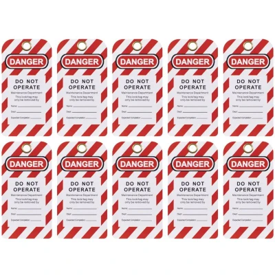 General description DANGER Do Not Operate tags prevent the start-up of machines under lockout. These heavy-duty tags feature a writable surface for lockout details and are designed for high visibility with a large danger warning in red color, making it easy to identify hazards. The set includes 10 tags, each equipped with an eyelet for easy securing with wire, string, or padlock. Technical specifications Tag Size: (W x H): 75 x 145 mm Other information 10-piece set Writable surface for lockout details High visibility red design Eyelets for securing with wire, string, or padlocks