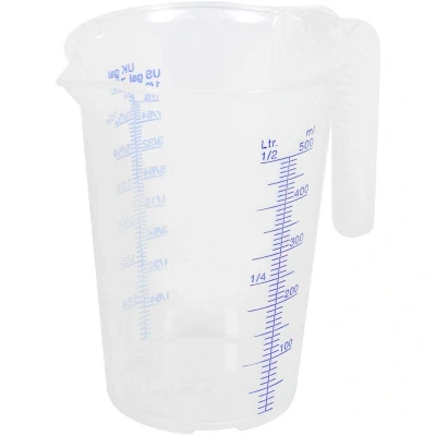 ManoManoGeneral description Translucent polypropylene measuring jug with an easy-to-read scale for accurate measurement (±1%). Ideal for precise liquid measurements in various DIY and home improvement tasks. Technical specifications Material: Translucent polypropylene Capacity: 0.5L Model No.: JT0500 Nett Weight: 0.05kg Measurement Accuracy: ±1% Other information