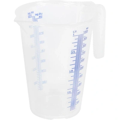 ManoManoGeneral description Translucent polypropylene measuring jug with an easy-to-read scale for accurate measurement (±1%). Ideal for precise liquid measurements in various applications. Technical specifications Material: Translucent polypropylene Capacity: 1L Model No.: JT1000 Nett Weight: 0.1kg Measurement Accuracy: ±1% Other information