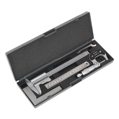 ManoManoGeneral description Sealey Measuring Tool Set 4pc includes four of the most commonly used precision engineering measuring and checking devices: a vernier caliper, a micrometer, a bevelled edge square, and a stainless steel rule. This comprehensive set is supplied in a convenient storage case. Technical specifications Contents: 200mm Vernier Caliper 0-25mm Micrometer 100 x 70mm Bevelled Edge Square 150mm (6") Stainless Steel Rule Model No.: AK91SET EAN: 5054511095203 Other information