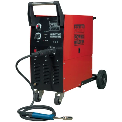General description Sealey MIGHTYMIG250 is a professional gas/gasless MIG welder designed for high performance and durability. It features a heavy-duty high output transformer and forced air cooling to maximize duty cycle performance. This welder is equipped with a high-quality BINZEL® MB25 Euro torch and is versatile enough to be used with large industrial CO2 gas bottles. Technical specifications Maximum performance: 250A Transformer: Heavy-duty high output Cooling: Forced air cooling Supplied accessories: 3m earth cable, 1.4m gas hose, twin gauged gas regulator, 0.8 and 1mm tips Other information 3 Year Guarantee* Lifetime guarantee on Transformer* This item is heavy; extra assistance is required at the delivery point for safe delivery.