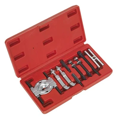 ManoManoGeneral description Sealey Mini Bearing Separator Set is a compact 9-piece set designed for efficiently separating bearings, small gears, wheels, and fittings from shafts. The set includes a bearing separator, yoke, and extensions, all conveniently supplied in a storage case. Technical specifications Model No.: PS996 Nett Weight: 0.65 kg Material: Chrome Vanadium components for durability Other information