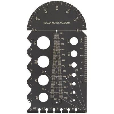 This gauge is not just limited to threads and sizes; it also functions as a set square, allowing users to measure angles between 0° and 180°. The included angle markings—15°, 30°, 45°, 60°, and 90°—enable accurate angular measurements, which is crucial in many construction and engineering applications.