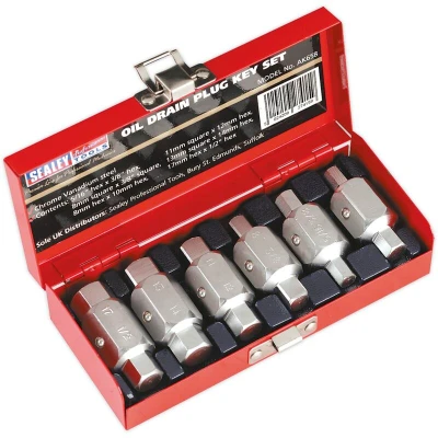 General description Sealey AK658 Double End Oil Drain Plug Key Set includes six double end carbon steel keys with a chemically blackened finish, designed for use with sump plugs on engines, gearboxes, and back axles. The set is supplied in a convenient storage case. Technical specifications Model No.: AK658 Material: Carbon steel Finish: Chemically blackened Quantity: 6 keys Compatibility and accessories Suitable for sump plugs on engine, gearbox, and back axle Use with a 19mm socket on a ratchet driver Other information