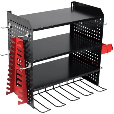 Heavy-duty powder-coated steel construction for strength and corrosion resistance. Holds up to four power tools with easy front-loading access. Three upper shelves for storing batteries, chargers, and accessories. Wall-mountable with pre-drilled holes. Accessories Included: Spanner Rack, Parts Storage Containers (x2), Drill Bit Holder, Tool Hooks (x8). Supplied flat-packed. HEAVY-DUTY STEEL CONSTRUCTION - Manufactured from durable steel for long-lasting strength. POWDER COATED FINISH - Provides an extra layer of protection for enhanced durability in demanding workshop environments. MULTI-TOOL CAPACITY - Designed to securely hold up to four power tools, such as drills, impact drivers and impact wrenches with easy front-loading access. INTEGRATED SHELVING - Features three upper shelves for storing batteries, chargers, hand tools, or accessories, keeping your workspace organised and efficient. WALL MOUNTABLE DESIGN - Easily mounts to garage or workshop walls with pre-drilled mounting