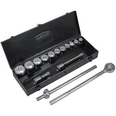 ManoManoGeneral description Manufactured from heat-treated, drop-forged high-grade carbon steel with chrome plating for corrosion resistance, the Sealey AK2585 Premier Socket Set is designed for durability and performance. The WallDrive® sockets grip the flats of the fixing, providing maximum torque transfer. This 15-piece set is supplied in a convenient storage case for easy organization. Technical specifications Material: High-grade carbon steel Finish: Fully polished Socket sizes: 19, 22, 24, 27, 30, 32, 36, 38, 41, 46, 50mm Drive size: 3/4'' Sq Drive Included tools: Reversible ratchet wrench, extension bars (100mm, 200mm, 450mm) Other information Lifetime guarantee*
